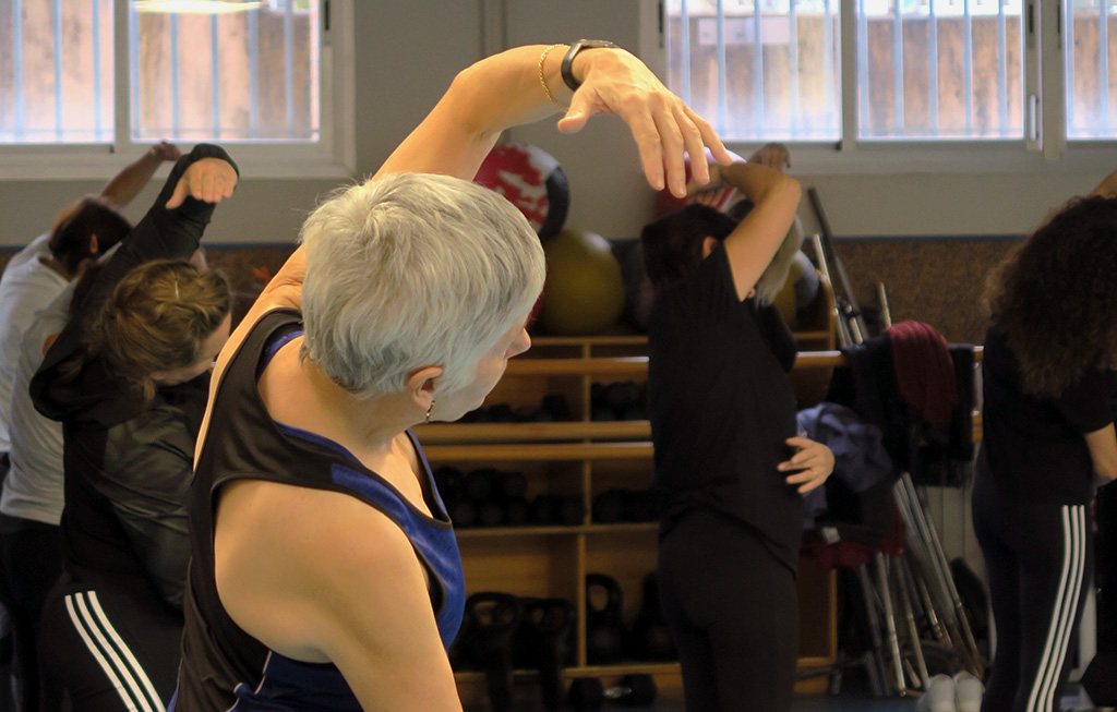 La sesión arranca con estiramientos suaves, de abajo hacia arriba. Las articulaciones se activan, las piernas se estiran y la columna se alinea. Las indicaciones de Itziar son claras: “Coge aire, exhala, cuidado con levantar en exceso los talones…” Cada movimiento se acompaña de una respiración consciente porque, como explica Itziar, “Saber respirar es indispensable. No sólo ayuda a concentrarnos, sino a ser conscientes de la postura que adoptamos y mantenerla”. Aprovechar la exhalación en los momentos de esfuerzo hace que el ejercicio sea más eficaz. La respiración costal evita que el transverso se desactive, y exhalar –como si empañaras un cristal– activa la musculatura”.